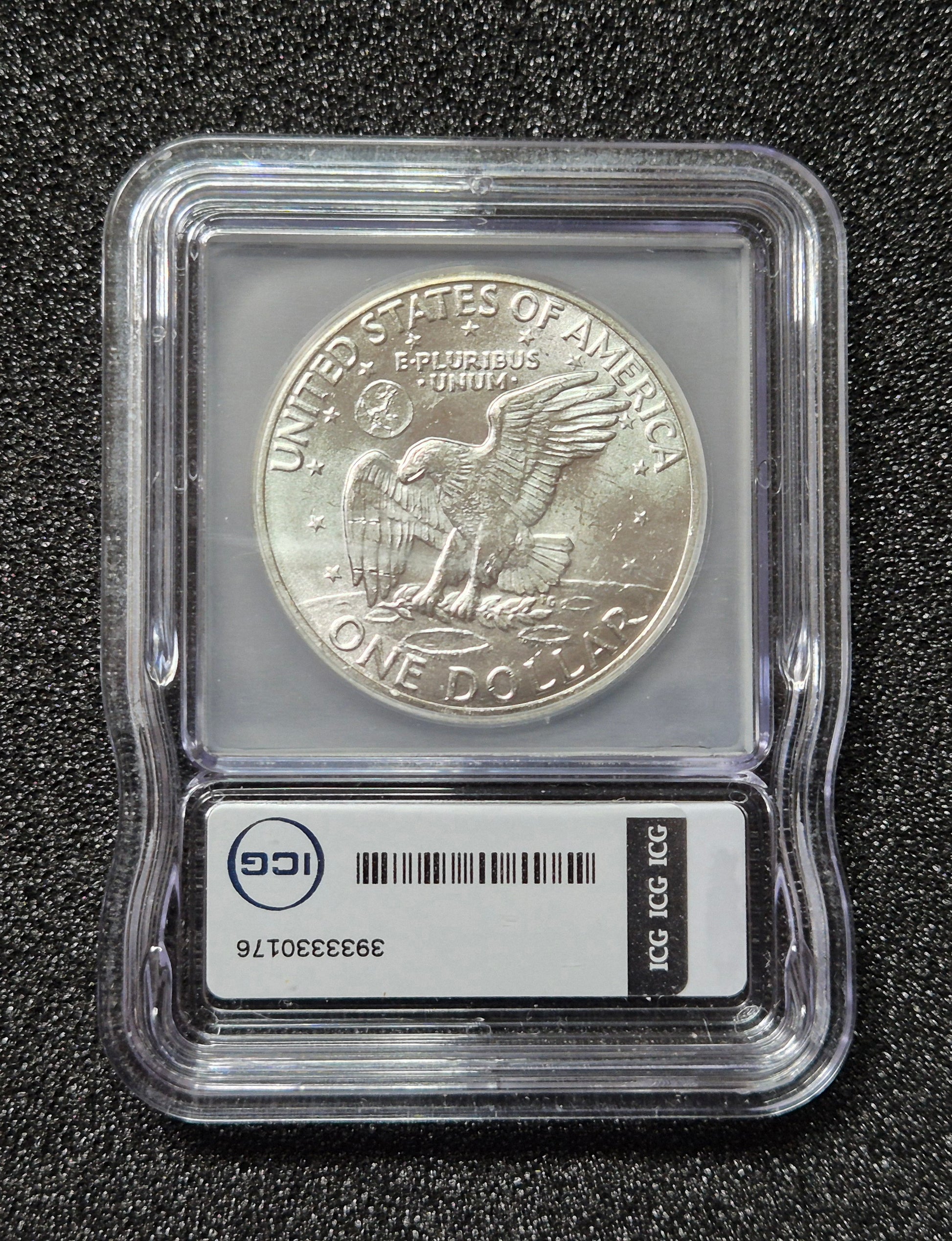 1971-S Eisenhower silver dollar that has been professionally graded by Austin Hutto and encapsulated by ICG (Independent Coin Grading Company). The obverse features President Dwight D. Eisenhower’s profile with the inscriptions “LIBERTY,” “IN GOD WE TRUST,” and the 1971 date. The reverse shows an eagle landing on the Moon, clutching an olive branch, with the Earth in the background — a design inspired by the Apollo 11 mission patch. This San Francisco–minted issue (“S” mint mark) was struck in a 40% silver composition for collectors, unlike the standard copper-nickel circulation strikes. The coin is certified MS67, meaning Mint State with exceptional luster, sharp strike, and virtually no visible marks under magnification — a very high grade for Eisenhower dollars. The slab label bears ICG’s logo, serial number, and the signature of company president Austin Hutto. Austin previously worked at NGC and PCGS, and is using these talents to turn around ICG. Coins such as the "Ike" dollar appeal to U.S. silver dollar collectors for their historical space-age design and premium condition rarity.