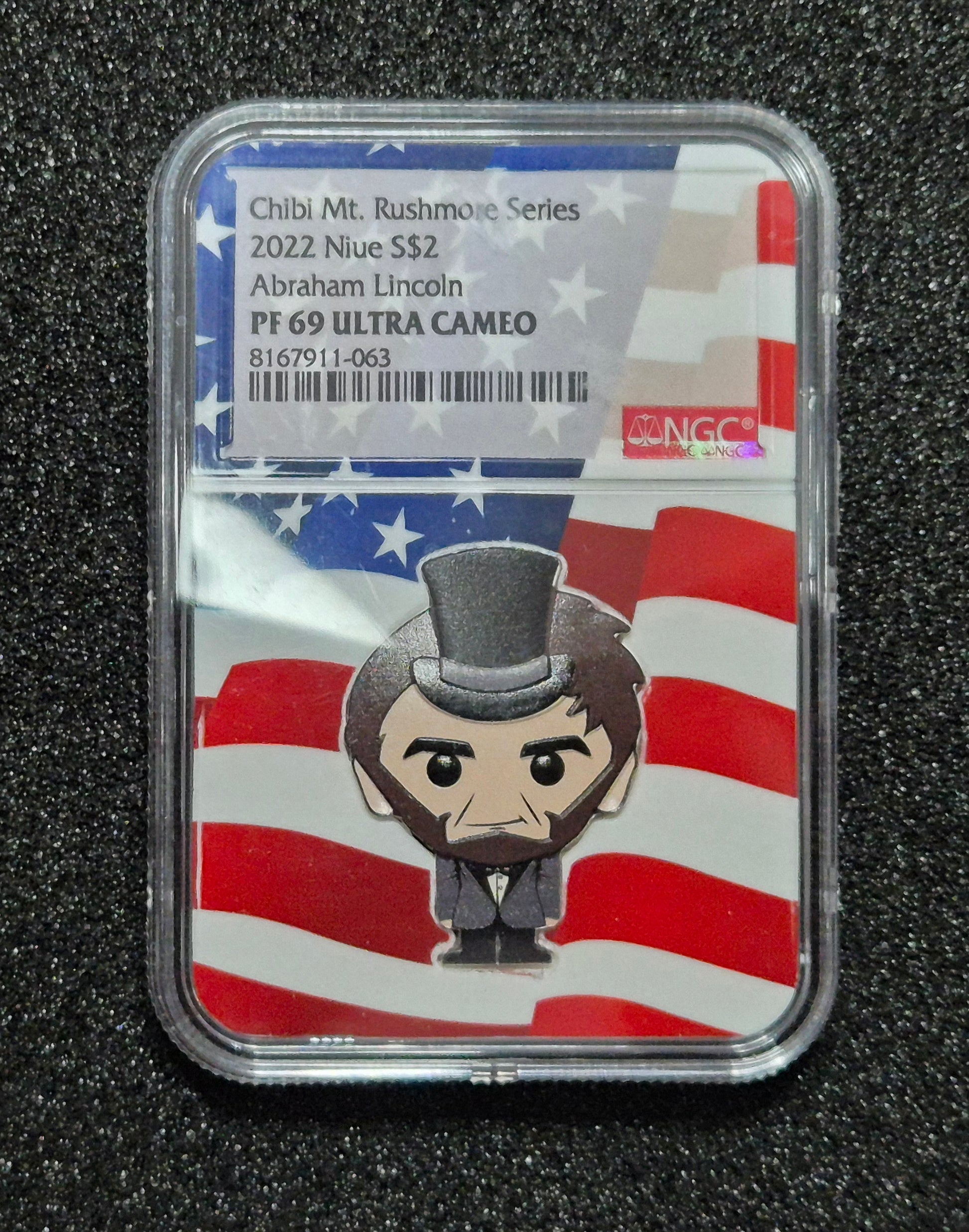 This collectible coin is part of the Chibi Mt. Rushmore Series and features Abraham Lincoln, one of America’s most iconic presidents. Issued by Niue in 2022, this $2 legal-tender coin is struck from 1 oz of .999 fine silver and graded PF 69 Ultra Cameo by NGC, indicating near-perfect quality with deeply mirrored fields and frosted relief. The coin’s design takes on the distinctive Chibi style, giving Lincoln a stylized, cartoon-like appearance complete with his trademark beard and top hat. The reverse displays the effigy of Queen Elizabeth II, denomination, purity, and issuing year. Encased in a tamper-evident NGC holder with an American flag-themed background, this piece blends historic reverence with modern pop-art flair. It appeals to collectors of both U.S. presidential memorabilia and contemporary silver coins, representing a creative fusion of numismatics and character design within a limited-mintage global issue.