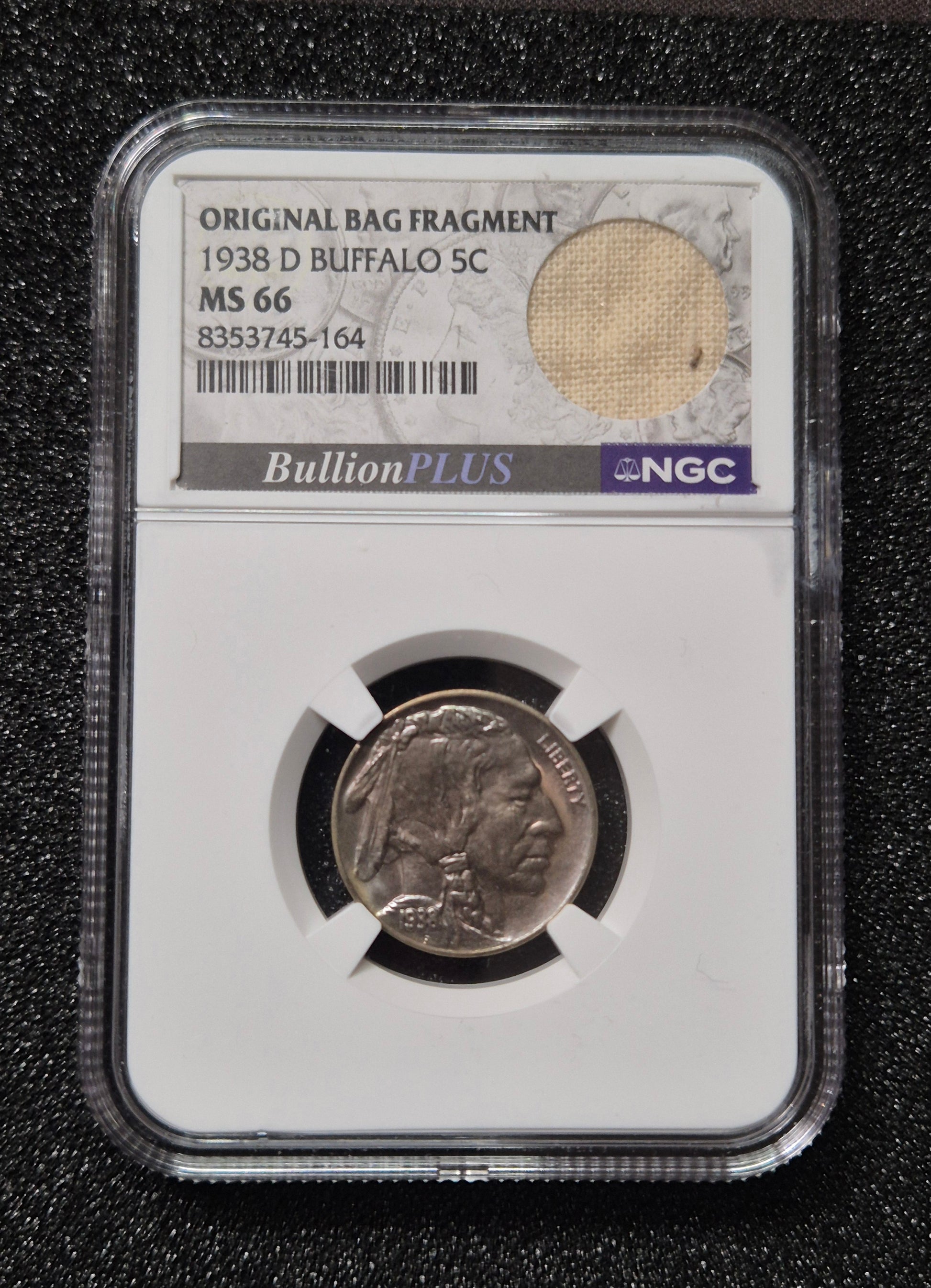 1938-D Buffalo Nickel (5¢), the final year of the Buffalo nickel series, struck at the Denver Mint. It is graded MS66 by NGC and presented with a BullionPLUS “Original Bag Fragment” label that includes a small piece of an original U.S. Mint bag.