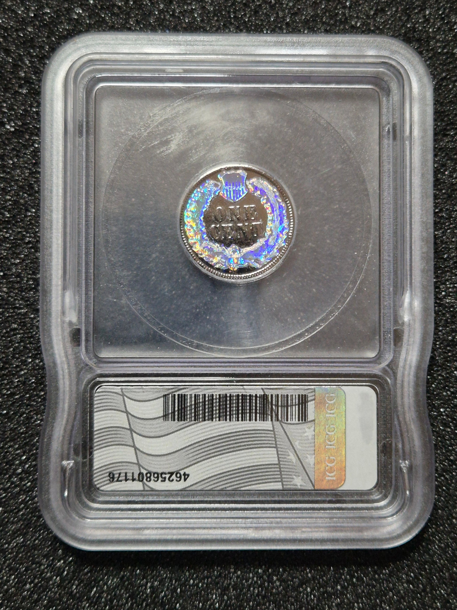 U.S. Indian Head Cent with a black ruthenium finish and holographic overlay for a striking modern appearance. The label reads “ICG – Genuine / Indian Cent / Ruthenium & Hologram”, meaning the coin itself is authentic but altered after minting (not an original Mint issue). The plating gives the coin a dark, metallic sheen, while the hologram creates a colorful, reflective effect over the classic Liberty headdress and reverse wreath. These types of enhanced coins are made for collectors.