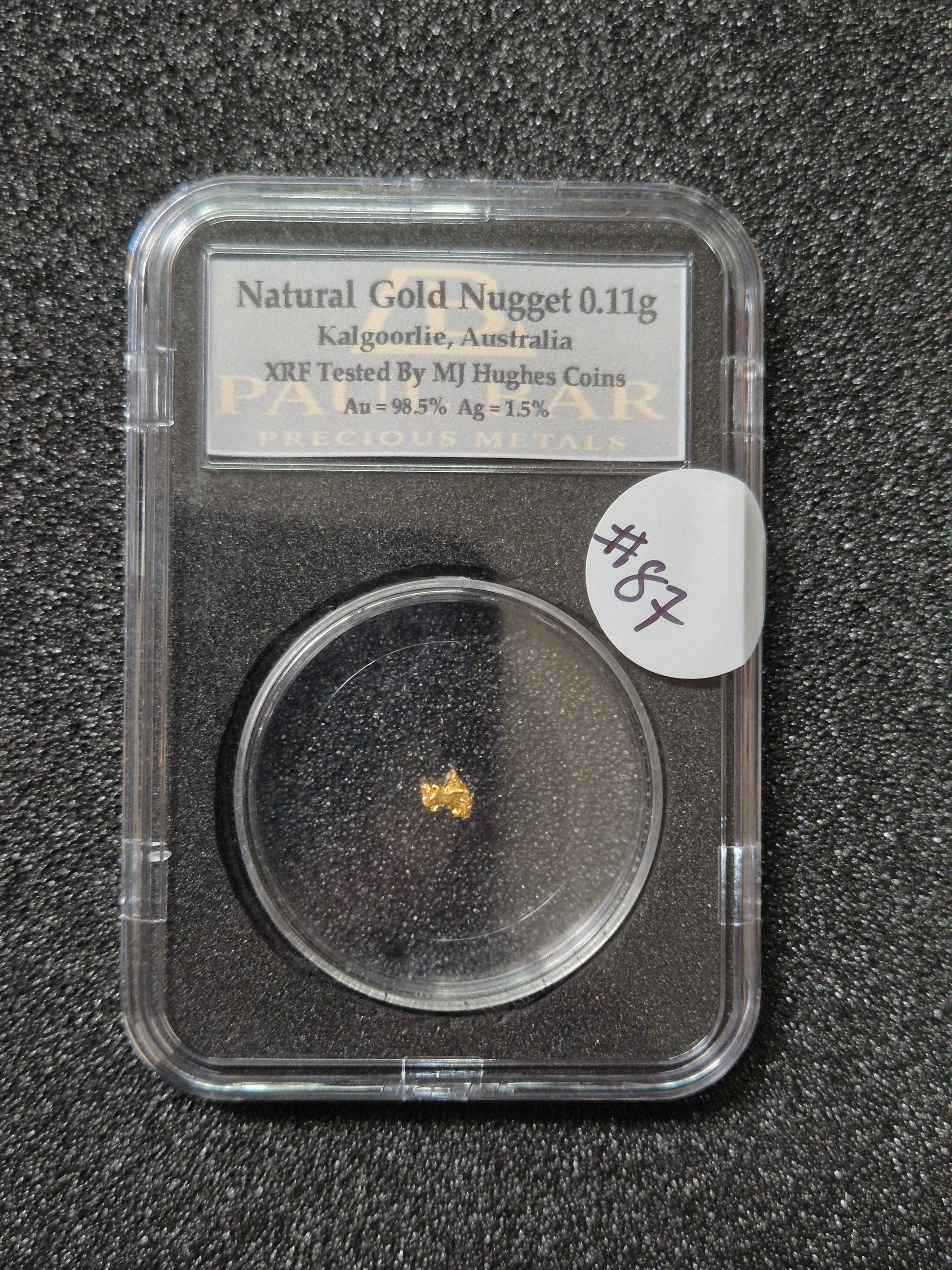 Introducing Nugget #87 – a stunning natural gold nugget sourced from Kalgoorlie, Australia, and offered by Paul Bar Precious Metals. Weighing 0.11 grams, this nugget boasts exceptional purity and provenance. XRF tested by MJ Hughes Coins, the nugget is composed of 98.5% gold (Au), 1.5% silver (Ag).